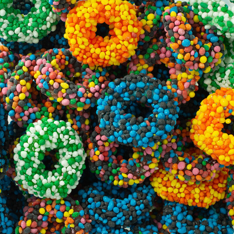 Gomas em forma de argolas, repletas de cores vibrantes e bolinhas crocantes com sabores a frutas, super divertidas para festas de aniversário e outras ocasiões festivas.